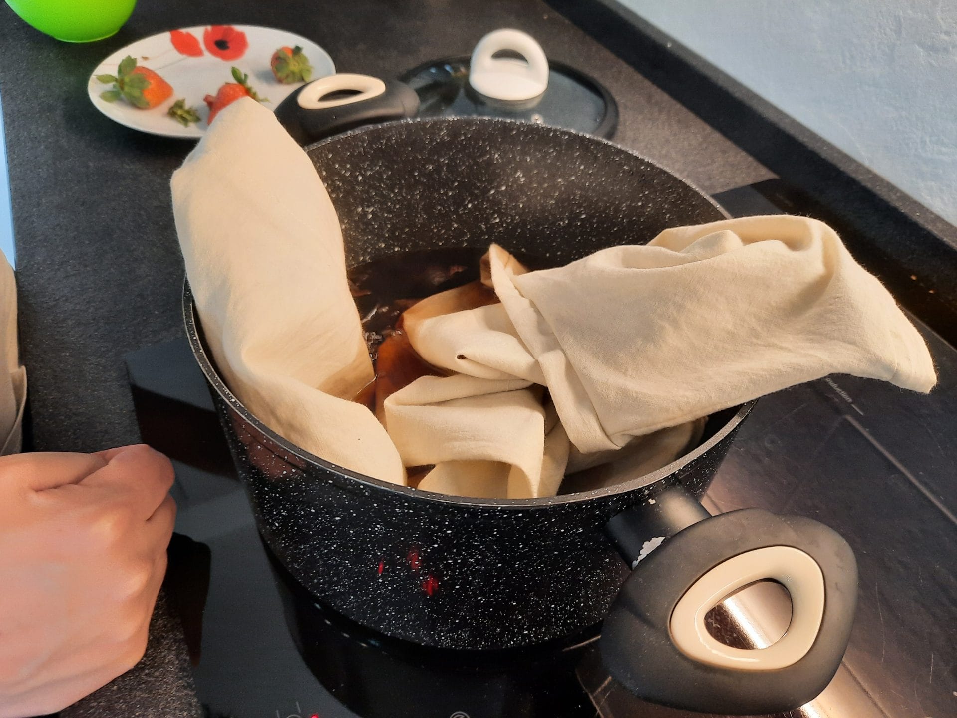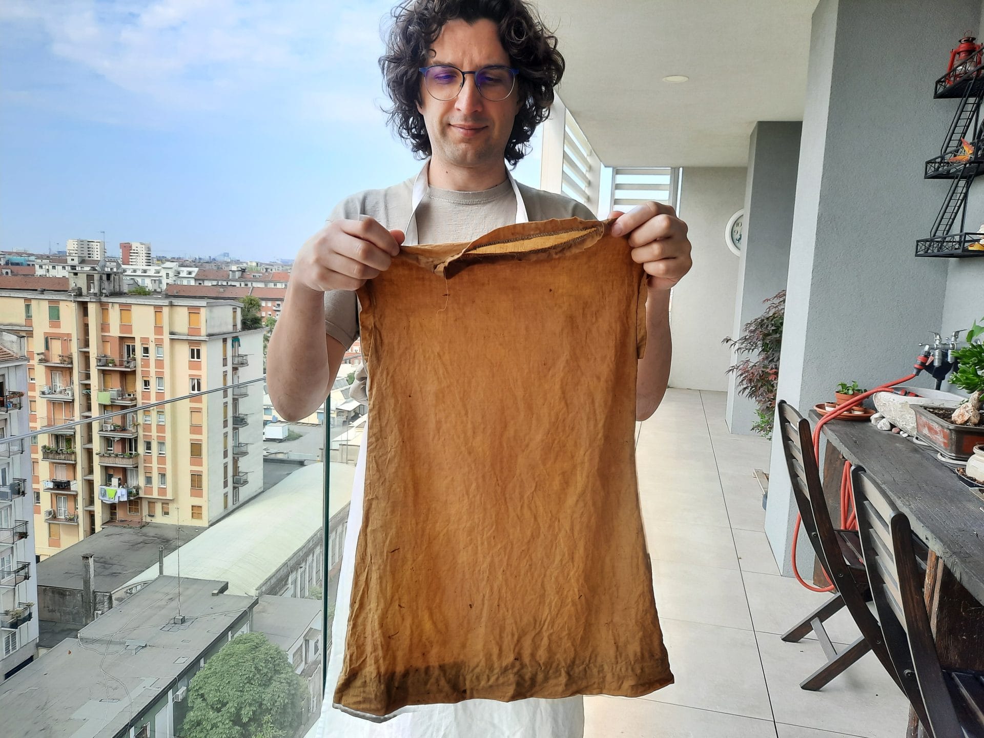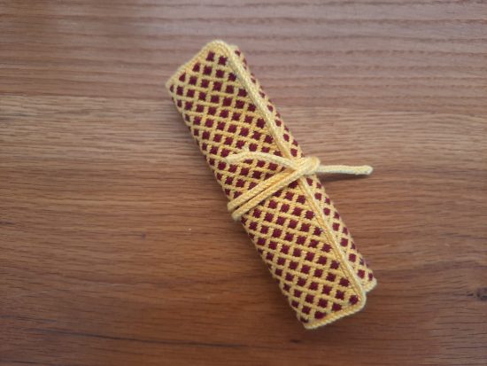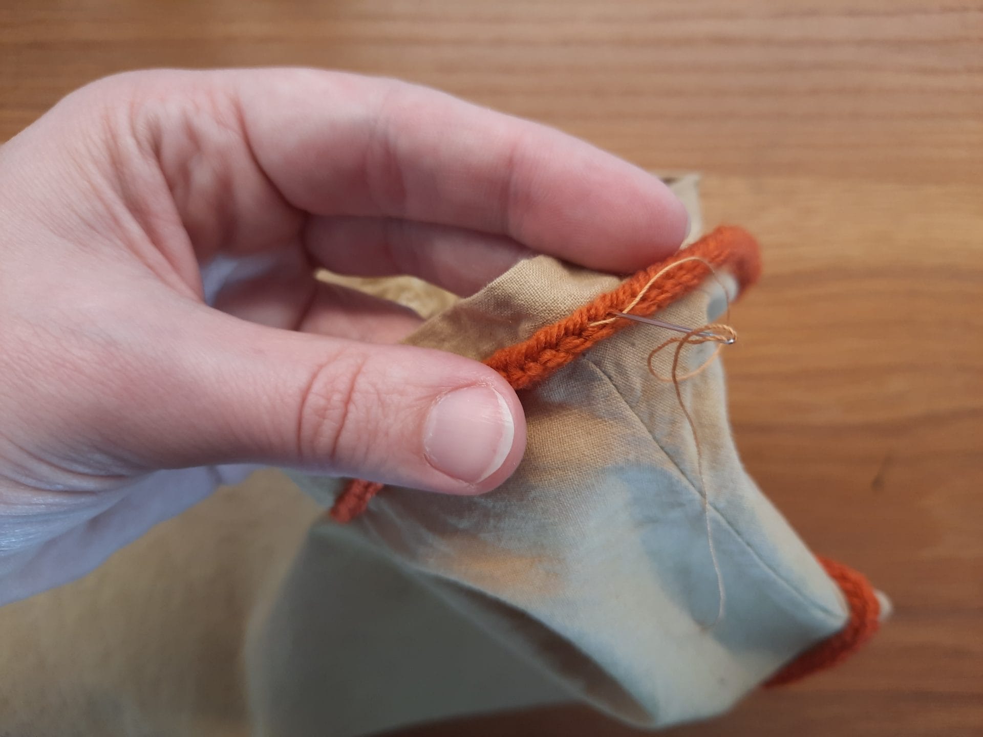 The fabric has been dyed with onions to give it an orangish tone. Completed with orange decorative braids on the neckline and arm holes, made using the lucet tool for cordmaking. The belt has been made with the same braiding method and yarn.
