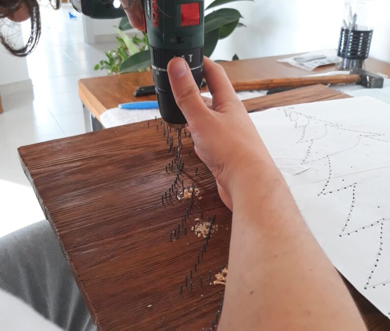 After hammering in the necessary nails for the weaving, my husband drilled holes. They were needed for electrical wires and a garland that would encircle the entire tree. We carefully marked the garland’s position on our pattern to ensure the holes were strategically placed. Also, another smaller hole was dedicated to the electrical wires, so it had to be hidden behind the weaving.