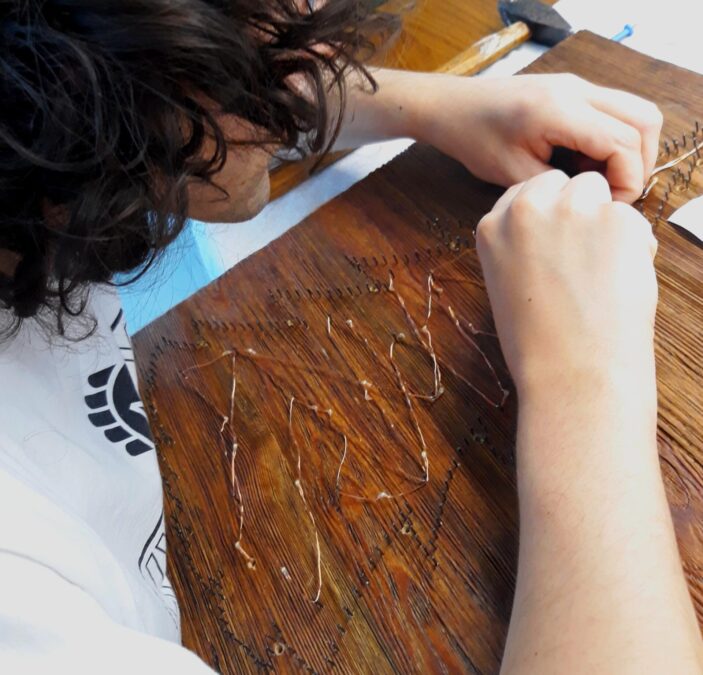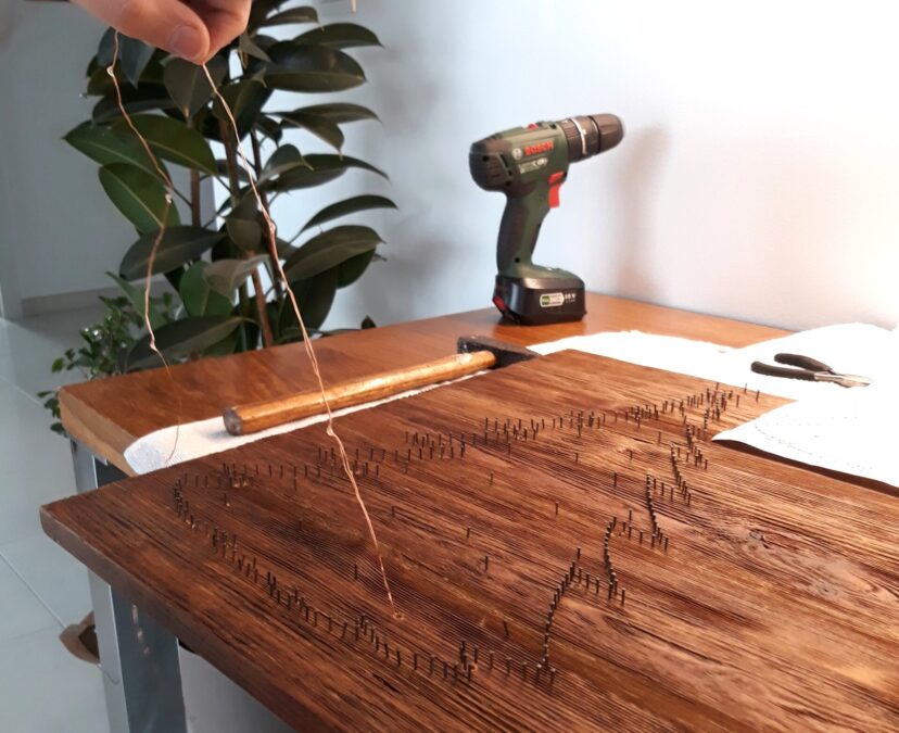 We did this gently by hand, without using weaving tools, to avoid damaging the LEDs. Also, we didn’t pull the wire too tight around the nails for the risk of breaking it. The yarn weaving on top was the main responsible for holding the lights in place.